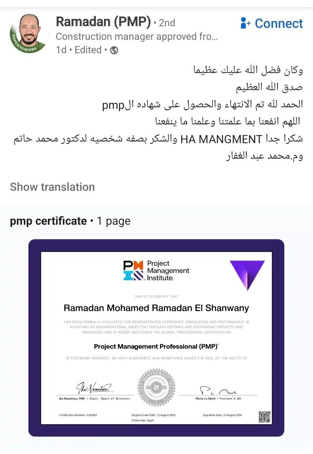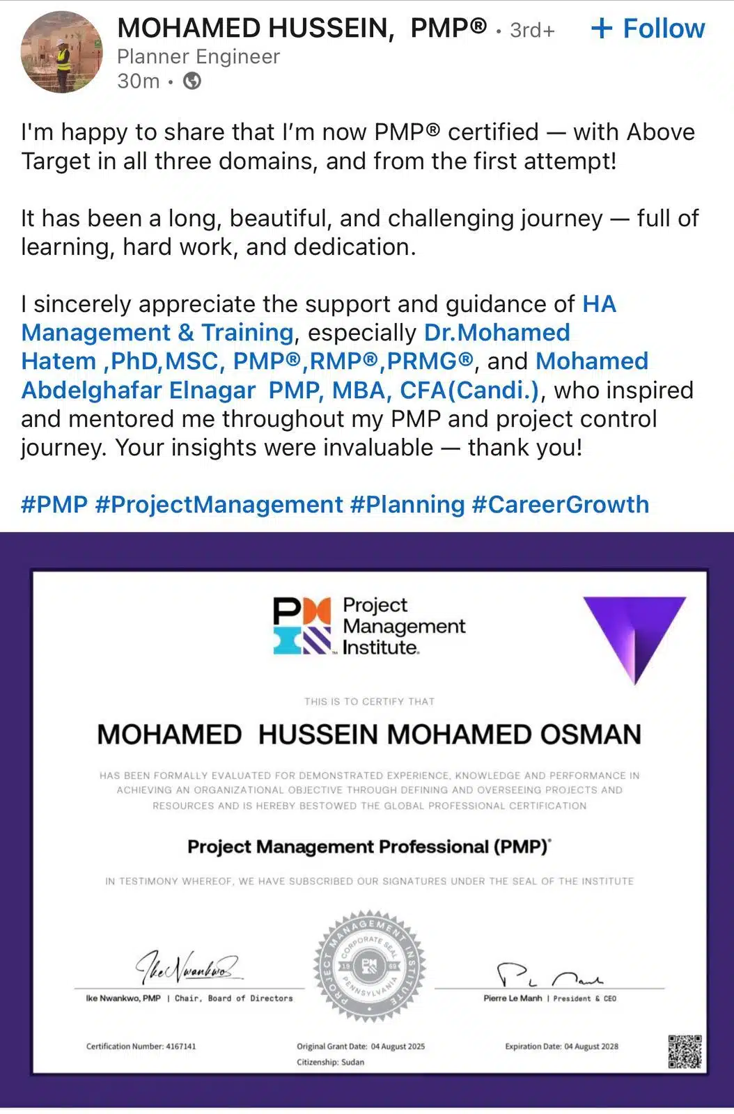 “التجربة مع HA مختلفة تمامًا. قبل كده كنت شايف إن الـPMP مجرد شهادة، لكن هنا حسيت إني فهمت الإدارة بشكل واقعي. الامتحان فعلاً كان أسهل بكتير مما توقعت.”