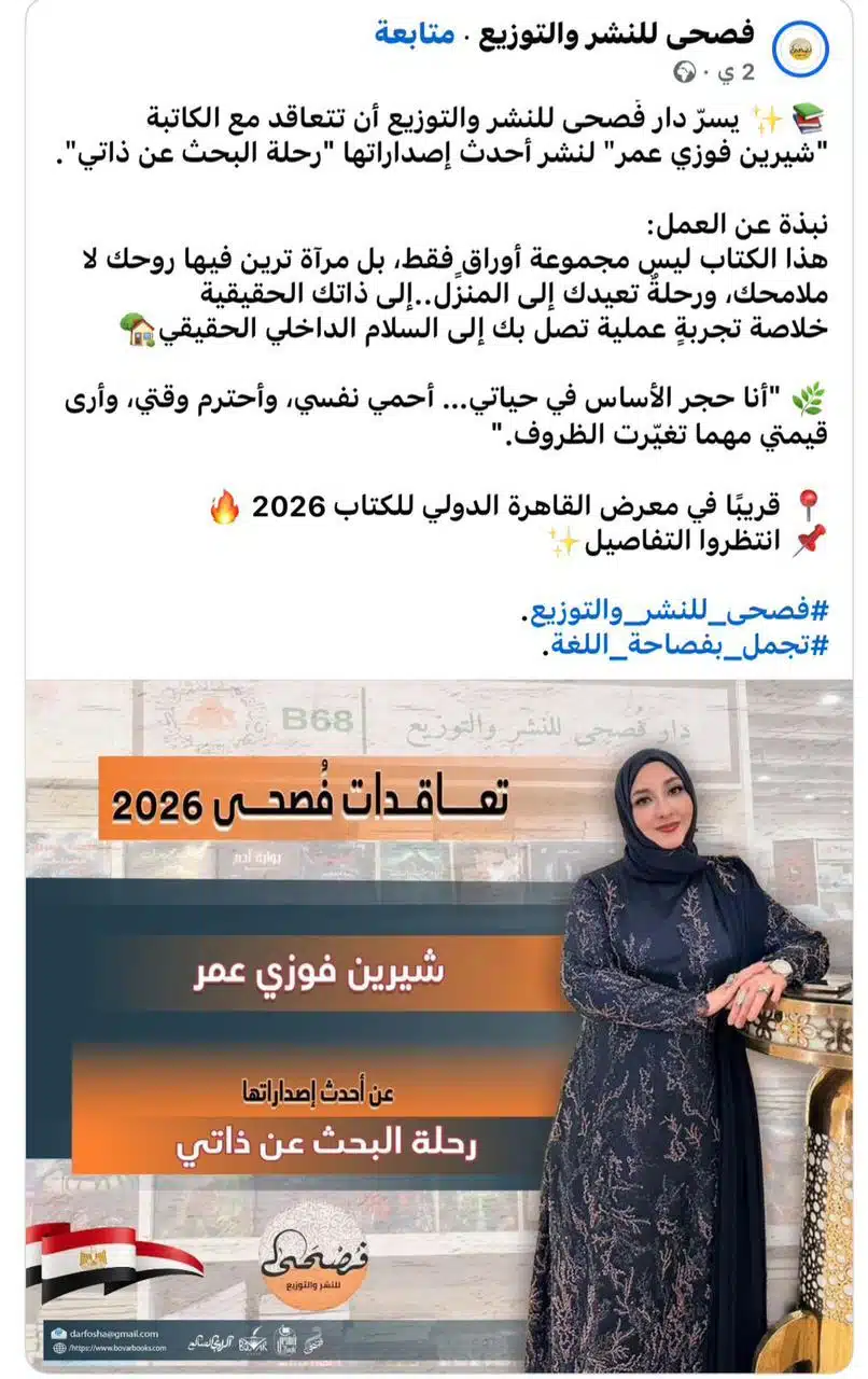 تستعد المدربة وكاتبة التنمية البشرية شيرين فوزي عمر لطرح كتابها الجديد في الأسواق قريبًا، وذلك بالتزامن مع مشاركتها في معرض القاهرة الدولي للكتاب، بالتعاون مع دار نشر فصحي.