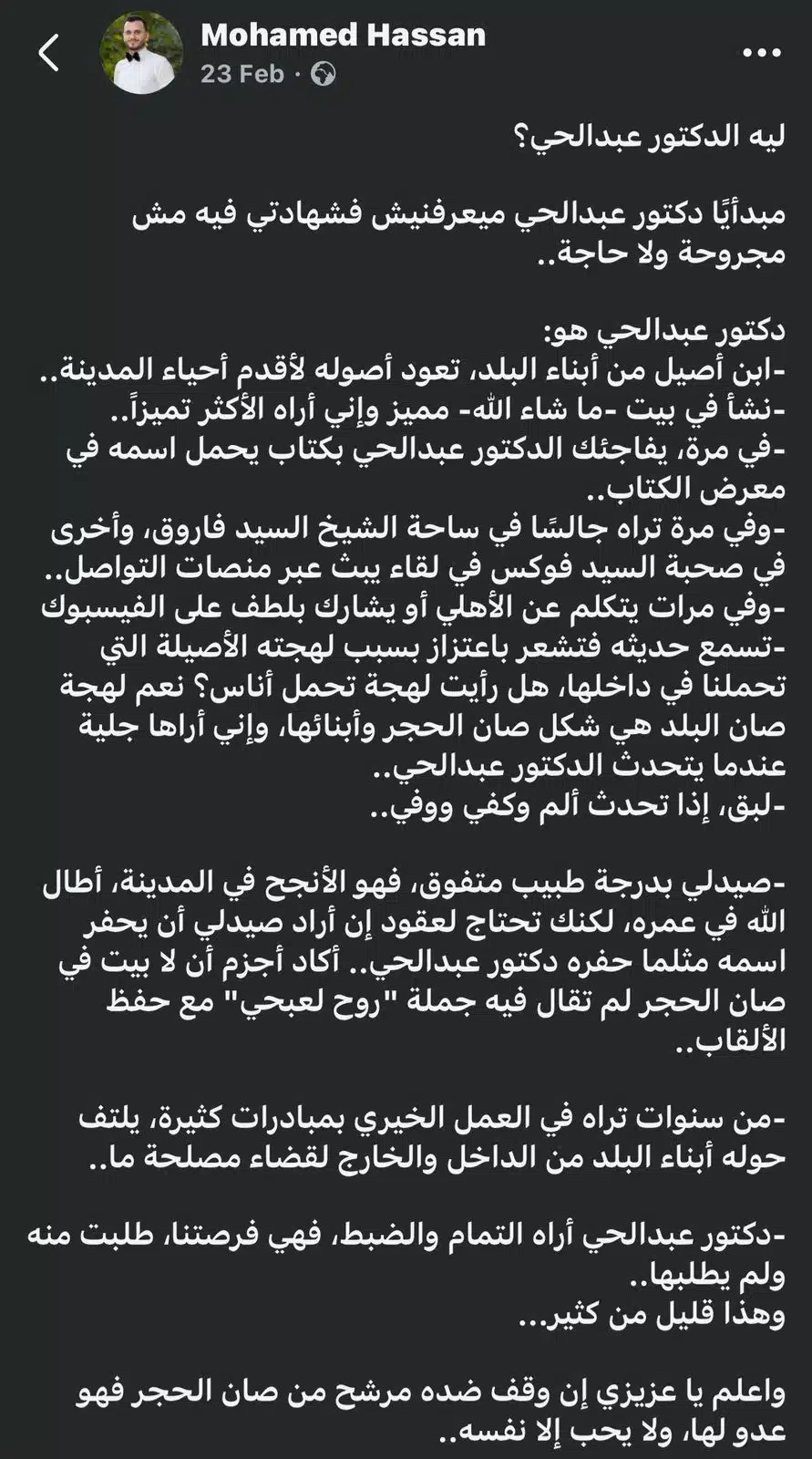 يعتبر الدكتور عبد الحي الفقي واحداً من الشخصيات المؤثرة في منطقة صان الحجر، حيث يتمتع بسمعة طيبة بين الأهالي، الذين يطلقون عليه لقب “دكتور الغلابة”. هذا اللقب يعكس روحه الإنسانية وعلاقته القوية مع المواطنين، الذين يرون فيه رمزاً للأمل والتحسين. كطبيب صيدلي، عمل الدكتور عبد الحي بجد لتوفير خدمات صحية أفضل لمجتمعه، ويُعتبر مدافعاً عن حقوقهم واحتياجاتهم.