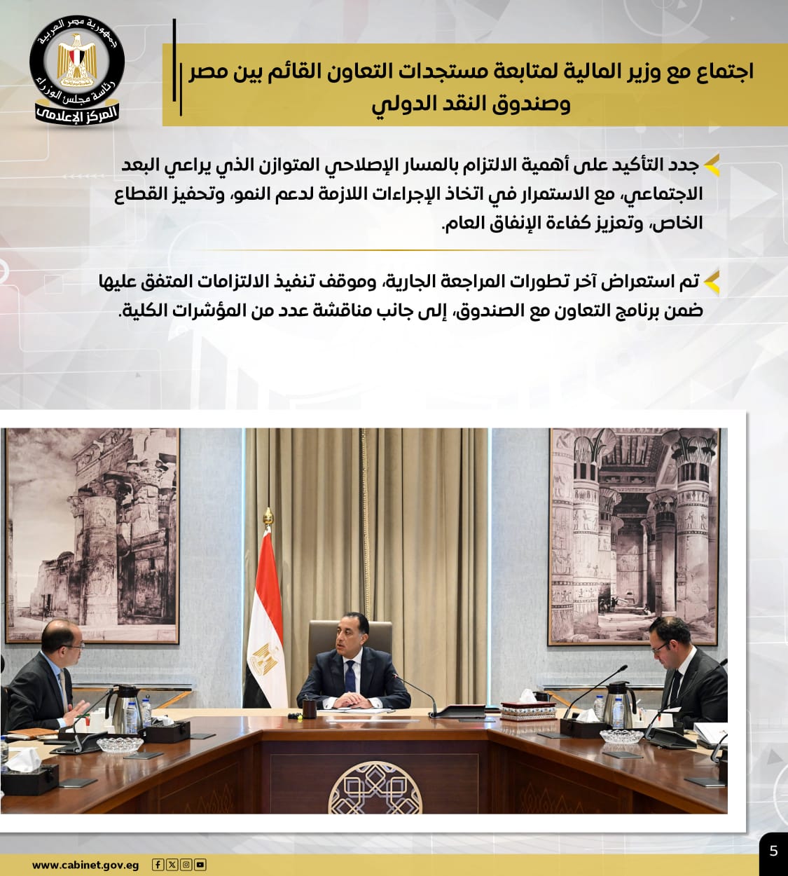 وعقد اجتماعا مع وزير المالية لمتابعة مستجدات التعاون القائم بين مصر وصندوق النقد الدولي، مُجددًا التأكيد على أهمية الالتزام بالمسار الإصلاحي المتوازن الذي يراعي البعد الاجتماعي، مع الاستمرار في اتخاذ الإجراءات اللازمة لدعم النمو، وتحفيز القطاع الخاص، وتعزيز كفاءة الإنفاق العام.