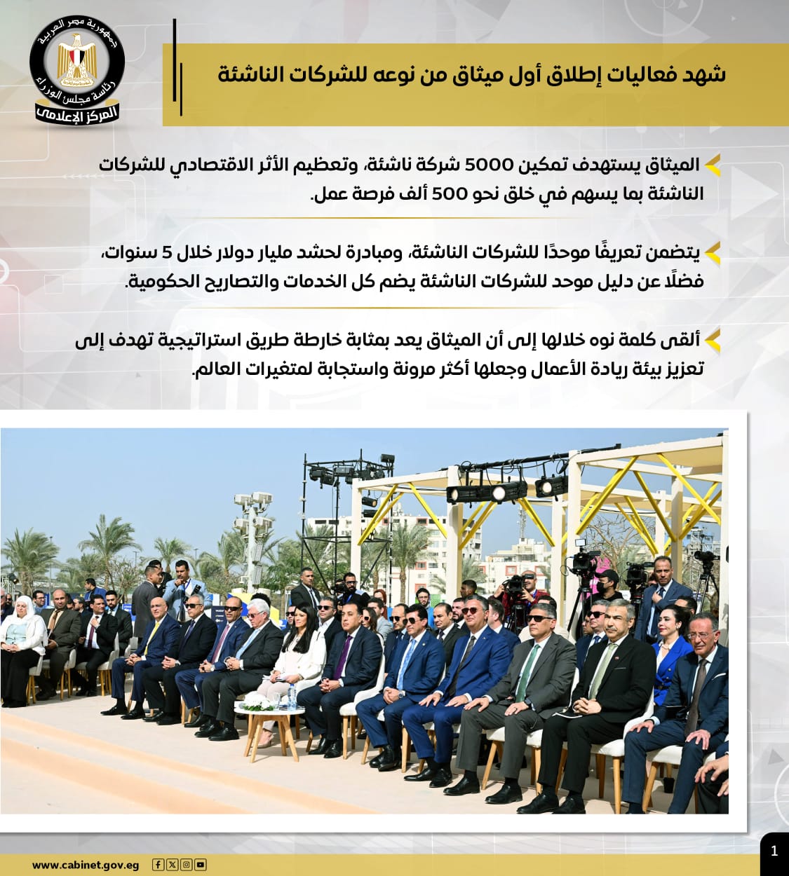 وتضمنت الأنشطة، حضور رئيس الوزراء فعاليات إطلاق أول ميثاق من نوعه للشركات الناشئة، والذي يستهدف تمكين 5000 شركة ناشئة، وتعظيم الأثر الاقتصادي للشركات الناشئة بما يسهم في خلق نحو 500 ألف فرصة عمل، كما يتضمن الميثاق تعريفًا موحدًا للشركات الناشئة، ومبادرة لحشد مليار دولار خلال 5 سنوات، فضلًا عن دليل موحد للشركات الناشئة يضم كل الخدمات والتصاريح الحكومية.