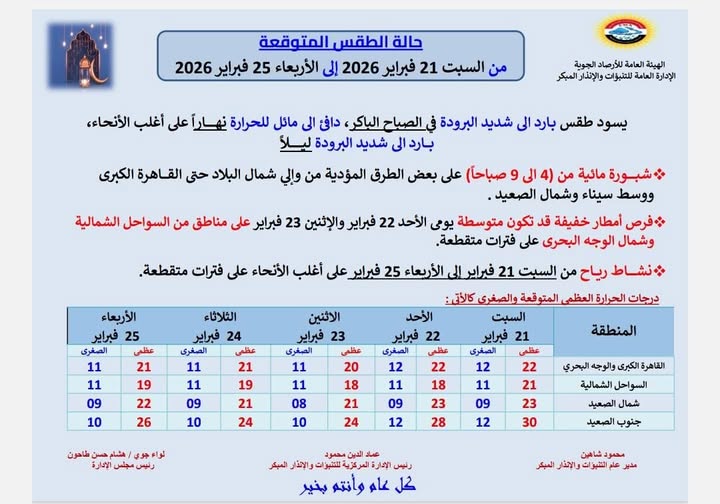 حالة الطقس اليوم السبت 21 فبراير 2026 في مصر، ثالث أيام الشهر الفضيل